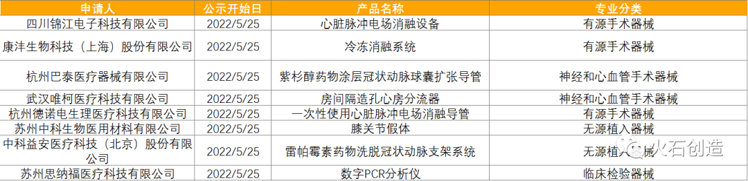 截至2022年6月8日,2022年5月国家局公示了8个三类医疗器械进入创新审批绿色通道,见表5。