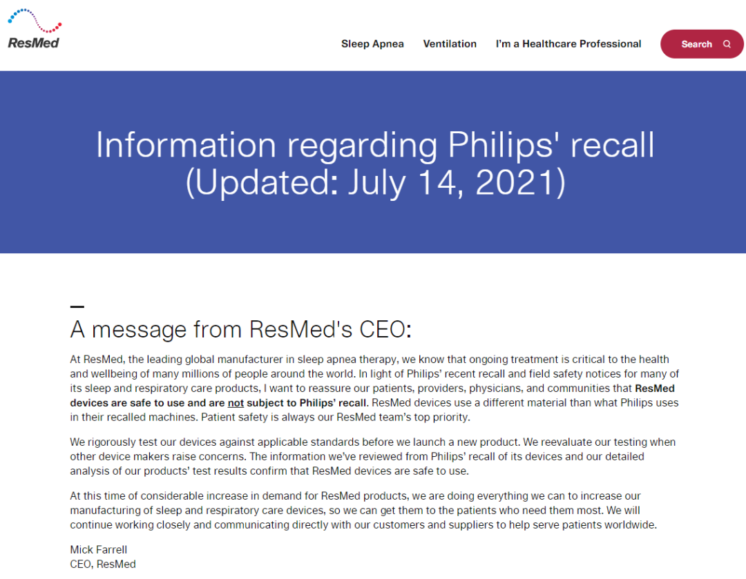 2021年6月,在飞利浦呼吸机发生多起召回事件之际,ResMed CEO曾表示,由于飞利浦召回CPAP给呼吸机市场留下了空白,呼吸机的需求增加,因此瑞思迈正努力完全填补这一缺口,并从推出新的气道正压通气 (PAP) 设备开始。