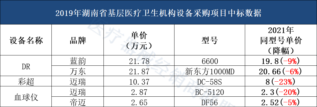 通过与之前的中标数据对比可以发现,DR、彩超、血球等设备的单台中标价在逐年降低。2021年湖南省省级补助基层医疗卫生机构设备采购项目中: