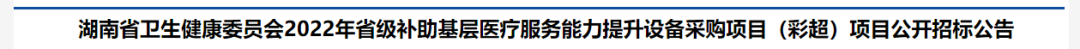 9月22日,湖南省政府采购网发布了《湖南省卫生健康委员会2022年省级补助基层医疗服务能力提升设备采购项目公开招标》(以下简称公告)。