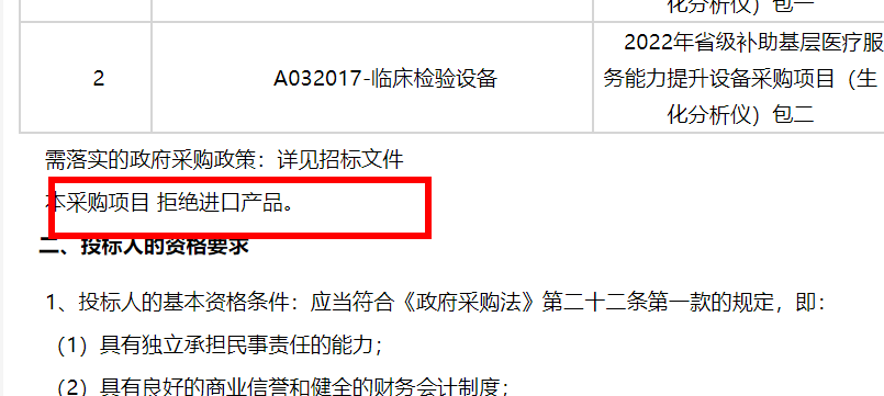 因此可以看到,所有设备采购文件中,都清晰注明:本采购项目,拒绝进口产品。