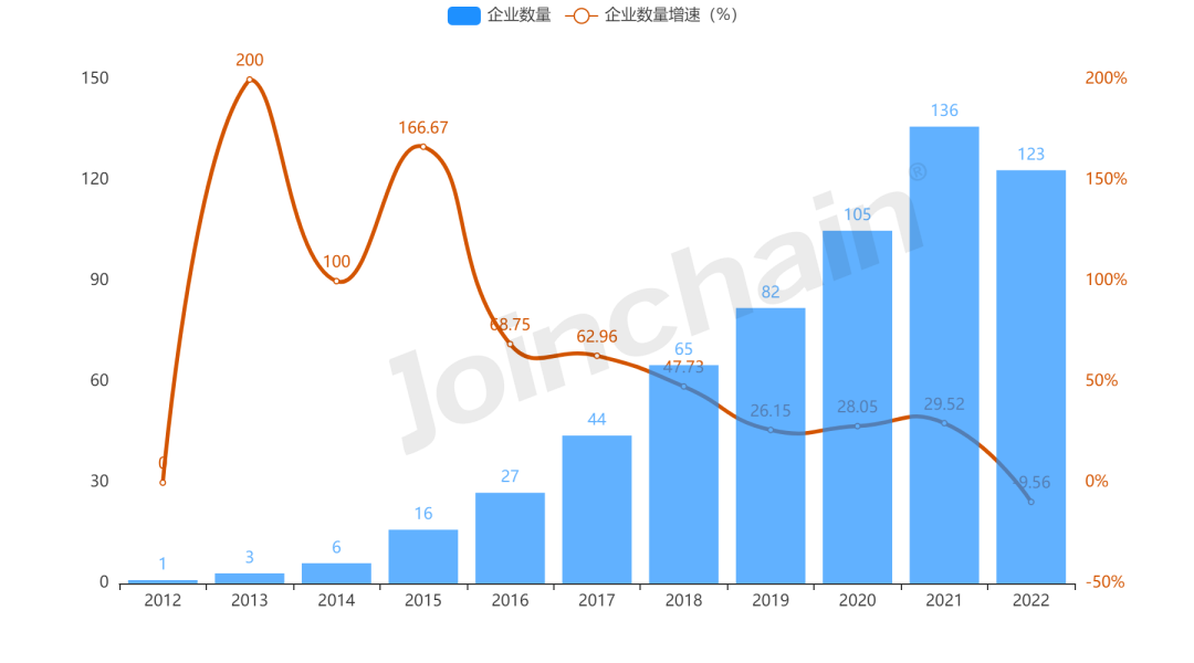 与往年的数据对比可以看出,自2012年起,我国可生产DR的企业连续9年上涨,2020年首度突破百家,2021年到达顶峰共有136家企业。而2022年首次出现回落,较上一年减少了13家企业。