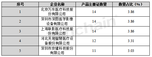 在列出的5大主要生产企业中,万东、深图、联影以14件产品并列第一。